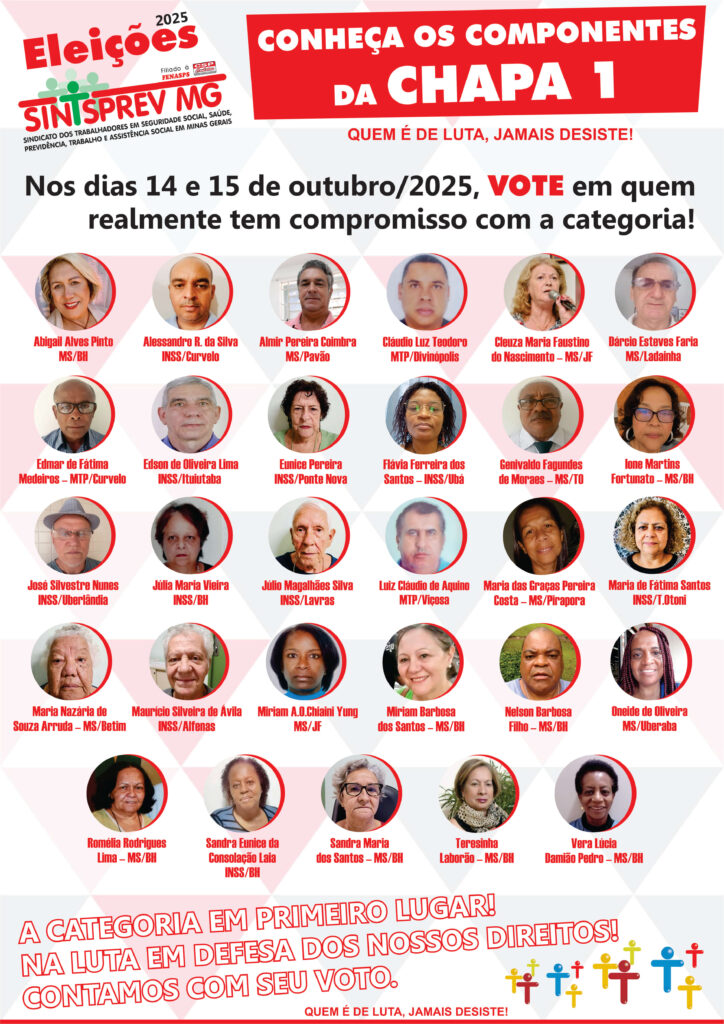 SINTSPREV/MG – A Comissão Eleitoral do SINTSPREV/MG – Triênio 2025/2028 – comunica aos filiados que, dentro do prazo previsto no artigo 61 do Estatuto da Entidade, foi inscrita para concorrer as eleições do SINTSPREV/MG uma única chapa, denominada: Chapa 01 – ¨SINTSPREV/MG – Quem é de luta jamais desiste! Na Luta por direitos ninguém será excluído! – Membros: 01- Abigail Alves Pinto – MS/BH; 02 – Alessandro Rodrigues da Silva – INSS/Curvelo; 03 – Almir Pereira Coimbra – MS/Pavão; 04 – Cláudio Luz Teodoro – MTP/Divinópolis; 05 – Cleuza Maria Faustino do Nascimento – MS/JF; 06 – Dárcio Esteves Faria – MS/ Ladainha; 07 – Edmar de Fátima Medeiros – MTP/Curvelo; 08 – Edson de Oliveira Lima– INSS/Ituiutaba; 09 – Eunice Pereira – INSS/Ponte Nova; 10 – Flávia Ferreira dos Santos- INSS/Ubá; 11 – Genivaldo Fagundes de Morais – MS/TO; 12 – Ione Martins Fortunato – MS/BH; 13 – José Silvestre Nunes – INSS/Uberlândia; 14 – Júlia Maria Vieira – INSS/BH; 15 – Júlio Magalhães Silva – INSS/Lavras;16 – Luís Claudio de Aquino – MTP/Viçosa;17 – Maria das Graças Pereira Costa – MS/Pirapora; 18 – Maria de Fátima Santos – INSS/TO; 19 – Maria Nazária de Souza Arruda – MS/BH; 20 – Maurício Silveira de Ávila – INSS/Alfenas; 21 – Miriam Aparecida de Almeida Chiaini Yung – MS/JF; 22 – Miriam Barbosa dos Santos – MS/BH; 23 – Nelson Barbosa Filho – MS/BH; 24 – Oneide de Oliveira – MS/Uberaba; 25 – Romélia Rodrigues Lima – MS/BH; 26 – Sandra Eunice da Consolação Laia – INSS/BH; 27 – Sandra Maria dos Santos – MS/BH; 28 – Teresinha Laborão – MS/BH; 29 – Vera Lúcia Damião Pedro – MS/BH, tal como determinado pelos artigos 62 e 63 do Estatuto. A partir de 22/09/2025, abre-se prazo para impugnação, nos termos do art. 68 do Estatuto. Belo Horizonte, 22 de setembro de 2025. Comissão Eleitoral SINTSPREV/MG: Odete Pereira Andrade; Edson Gualberto de Souza; Reginélia Catharina Glicério; Edenilse Ribeiro Matos; Carlos Alberto Merhy Silva; Lídia de Jesus
