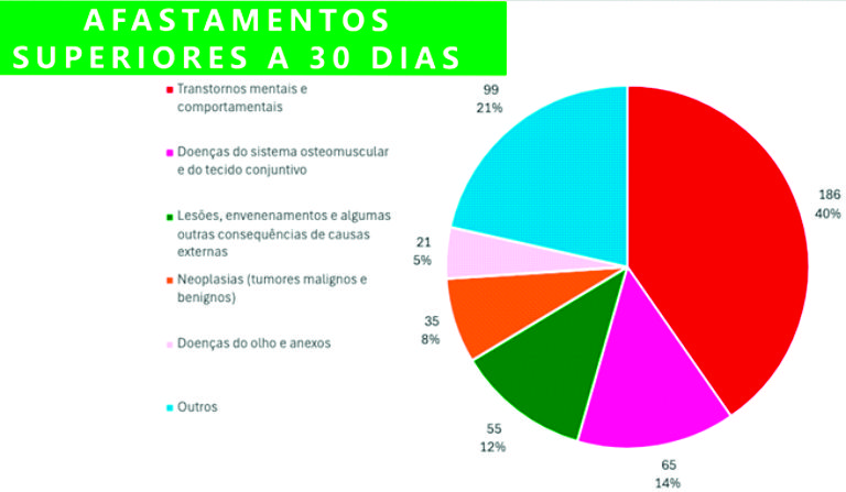 A gestão apresentou então alguns gráficos apontando percentuais relacionados as causas e doenças nos atuais afastamentos. Verificou-se que transtornos mentais e comportamentais lideram os afastamentos acima de 30 dias, alinhando-se com a preocupação e os diversos relatos da FENASPS acerca da precariedade da saúde do nosso servidor, principalmente no que tange a saúde mental, com diversos casos de suicídio em regiões de todo o Brasil e conforme já apontava o estudo realizado pela FENASPS em conjunto com a UNB.