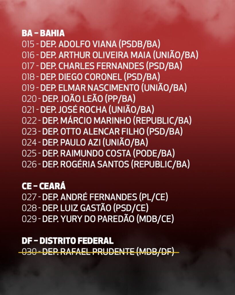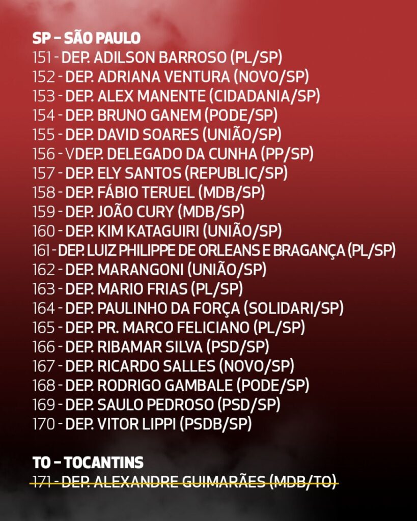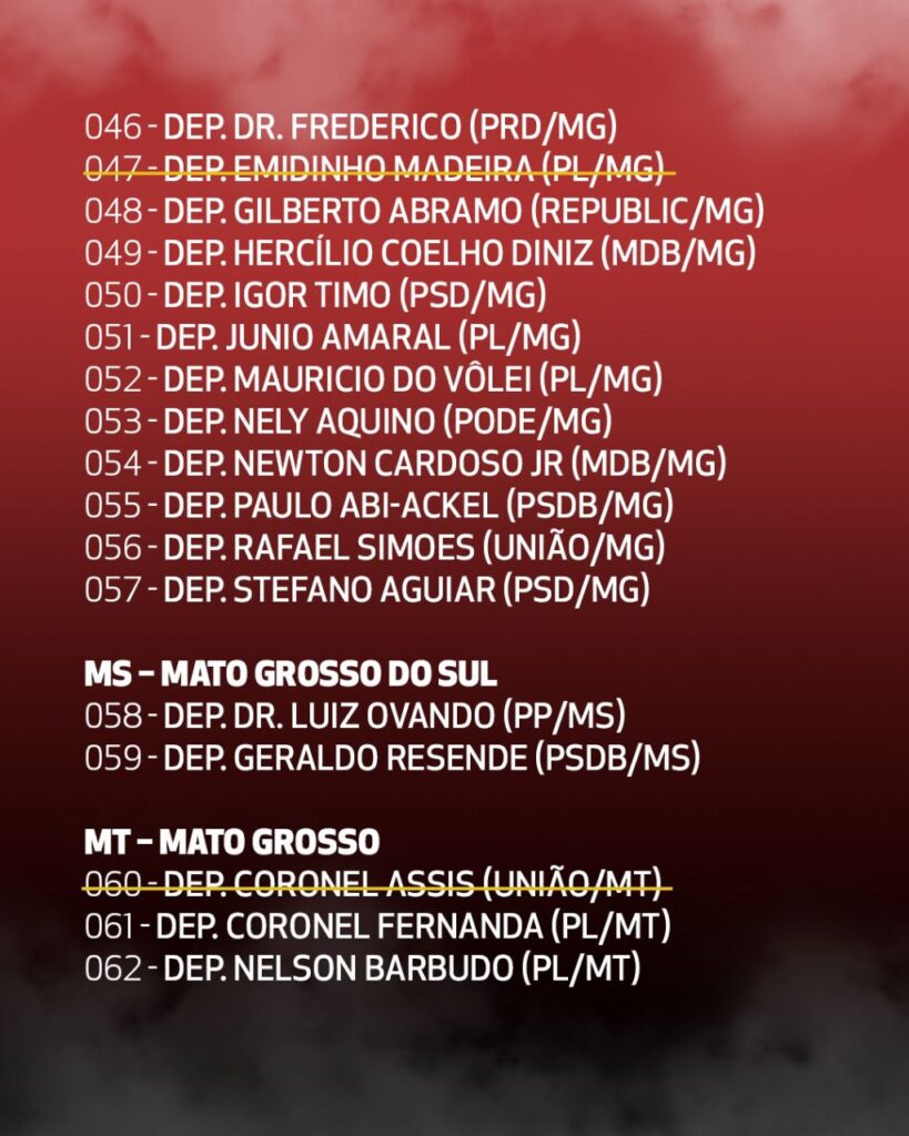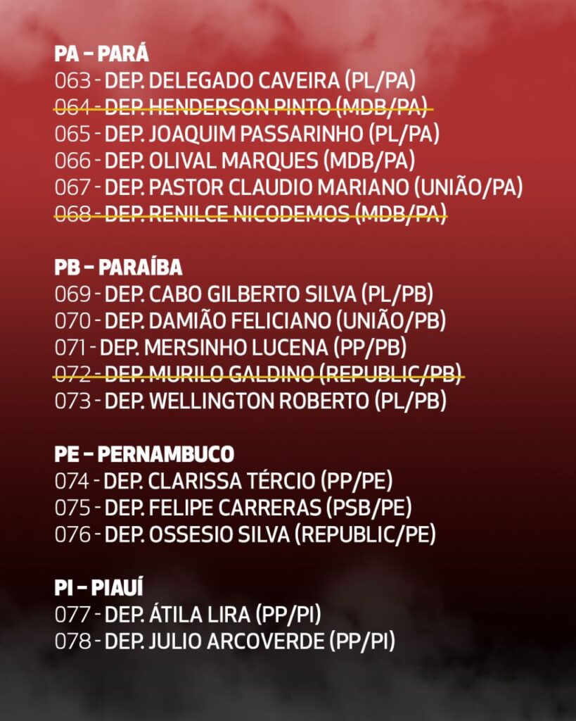 (*) Além dos 16 nomes riscados nessa lista, hoje tivemos a retirada também da assinatura do Adail Filho (Republicano/AM).