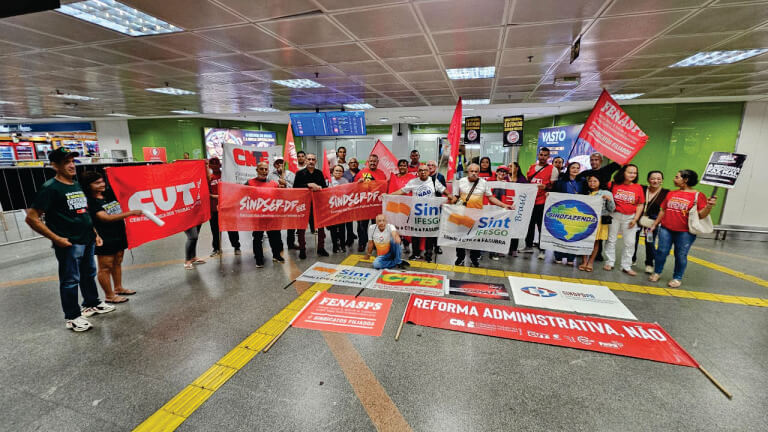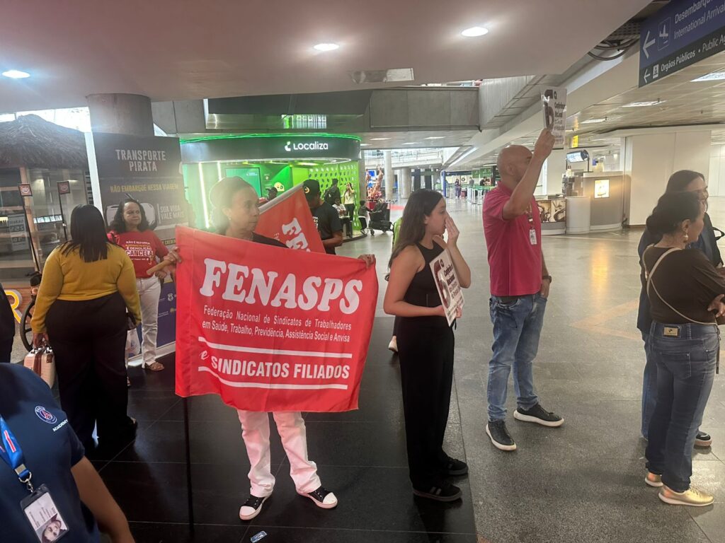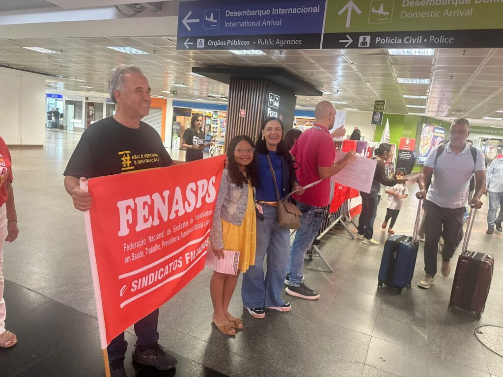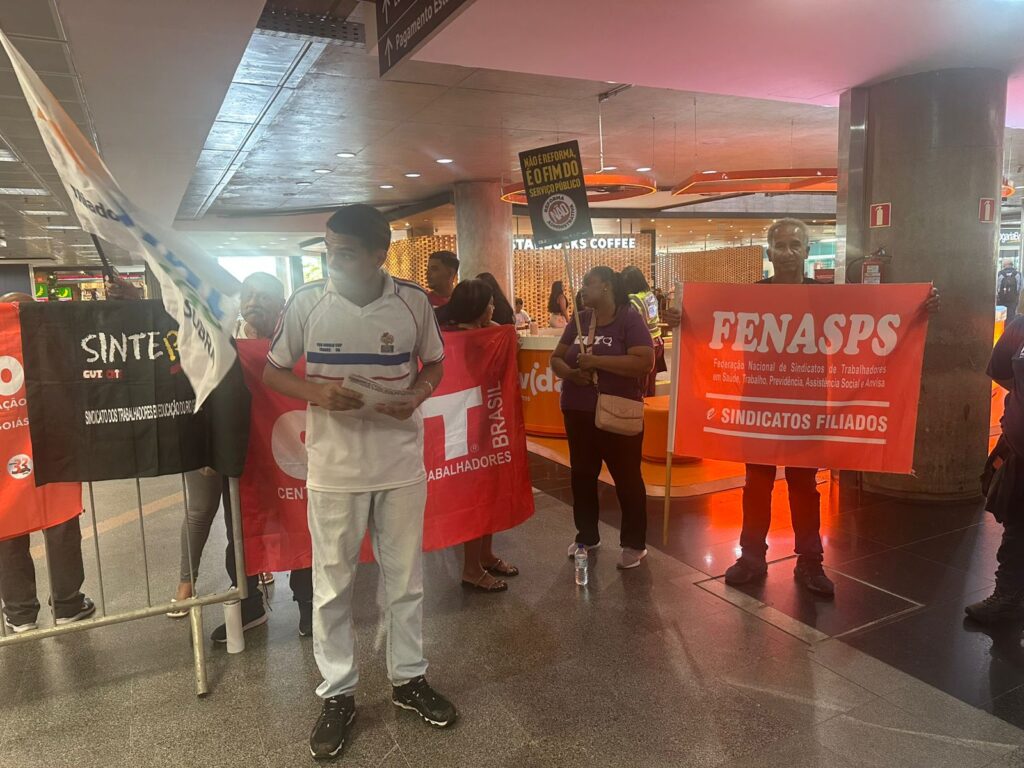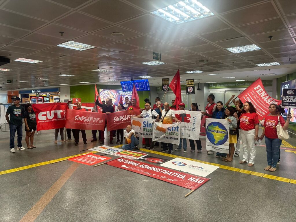FENASPS E ENTIDADES DO FONASEFE DAS TRÊS ESFERAS E CENTRAIS SINDICAIS REALIZARAM ATO, HOJE 16/12, NO AEROPORTO DE BRASÍLIA NA LUTA CONTRA A PEC 38 – REFORMA ADMINISTRATIVA
