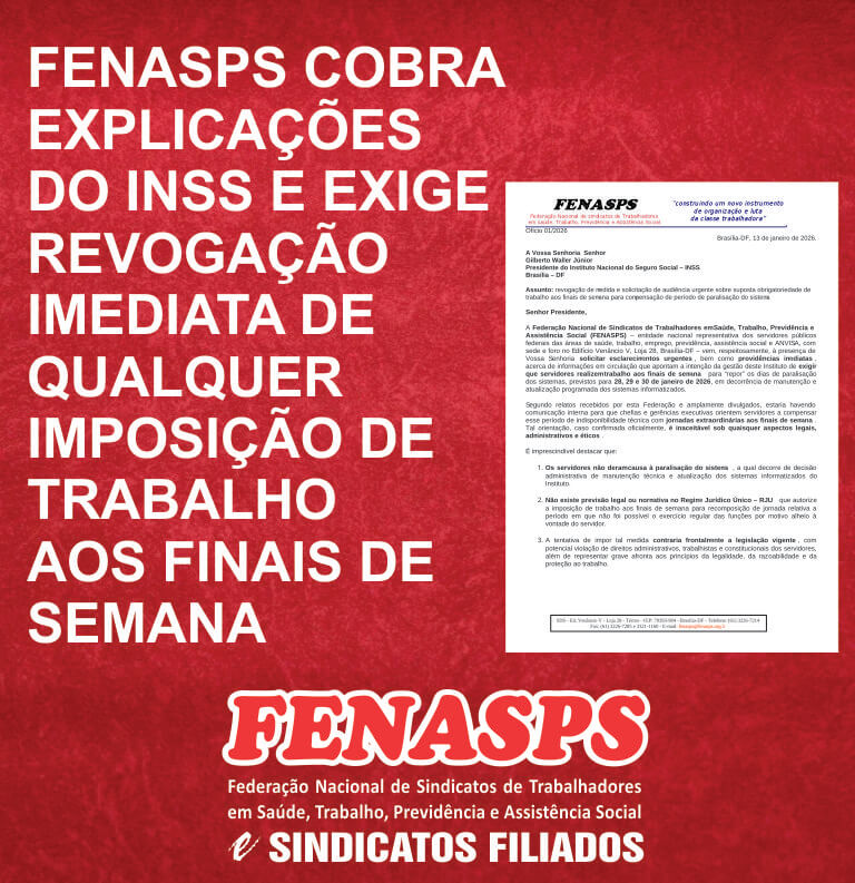 A FENASPS já havia se pronunciado publicamente sobre essa situação, denunciando a tentativa de impor trabalho aos finais de semana e alertando para a ilegalidade da medida, conforme matéria publicada em 9 de janeiro de 2026 no site da Federação – veja aqui https://fenasps.org.br/2026/01/09/inss-tenta-impor-trabalho-aos-finais-de-semana-para-repor-periodo-de-paralisacao-do-sistema/. Diante da persistência dos relatos, a Federação formalizou a cobrança por meio de ofício encaminhado à Presidência do INSS.