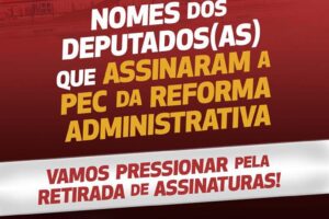 Até agora (10/11), conseguimos a retirada de 17 assinaturas à PEC 38/2025. Nossa mobilização tem surtido efeito e não vamos recuar! Confira a lista com os nomes dos deputados(as) que assinaram a PEC da Reforma Administrativa e pressione os(as) ... leia mais